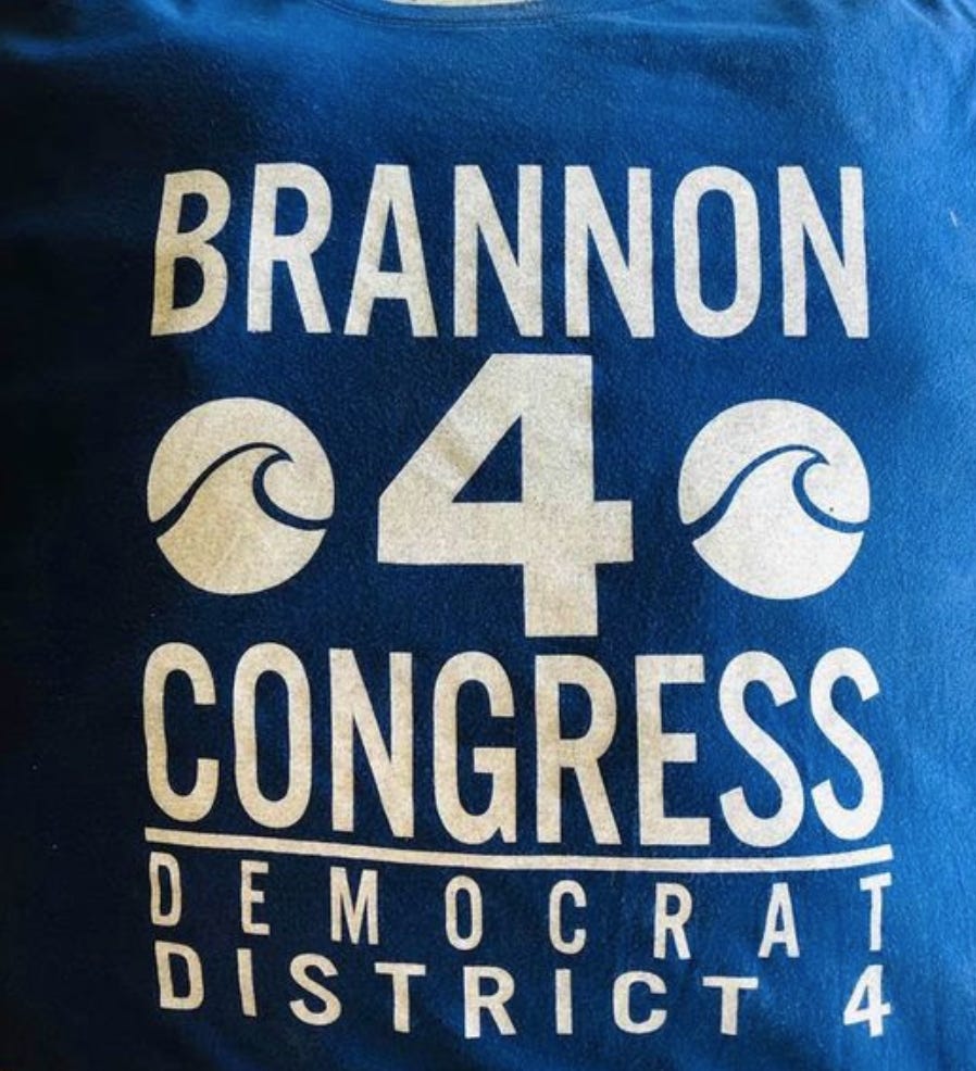 My supporters search the box and pick out the size that fits. A married couple who come to all my events ask me to take a picture of them wearing the Brannon4Congress shirts. I take several pictures and realize something about the shirt design. The circles with the “waves” give a buxom woman a somewhat vulgar dimension.