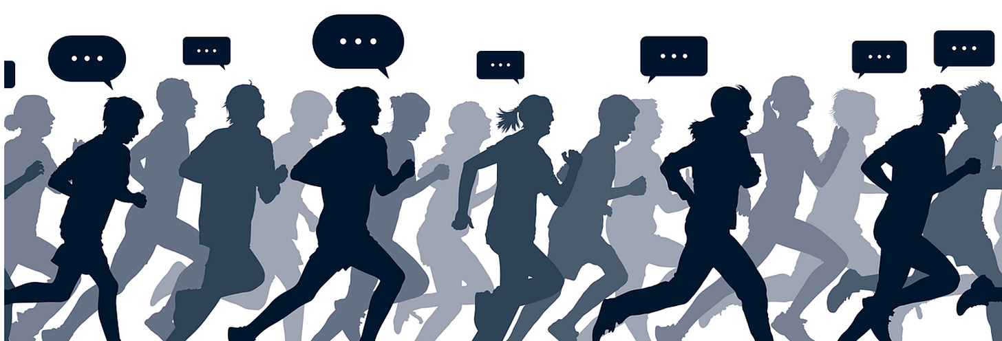 The husband, red-faced, trying to catch his breath yet attempting to appear cool, says, “I wasn’t in last place this time. I saw two people behind me.”